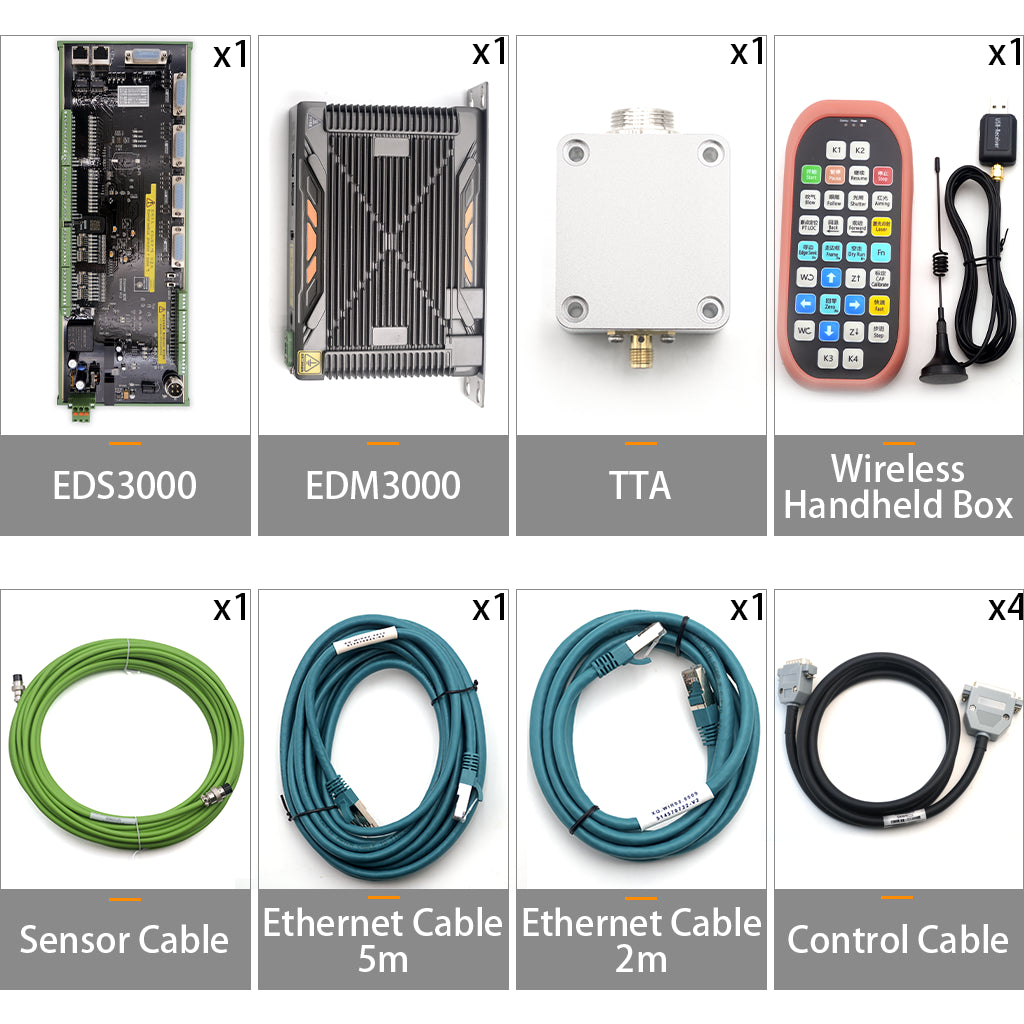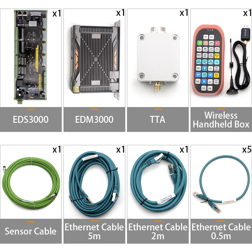 Packing weight:6kg; Packing size:400*400*250mm; Packing Content: EPC-2000, EDS3000 I/O Module, Wireless Handheld Box, TTA, EDS2010 I/O Module (optional), Control Cable, Ethernet Cable, Sensor Cable, Dongle, Rectifier Diode.